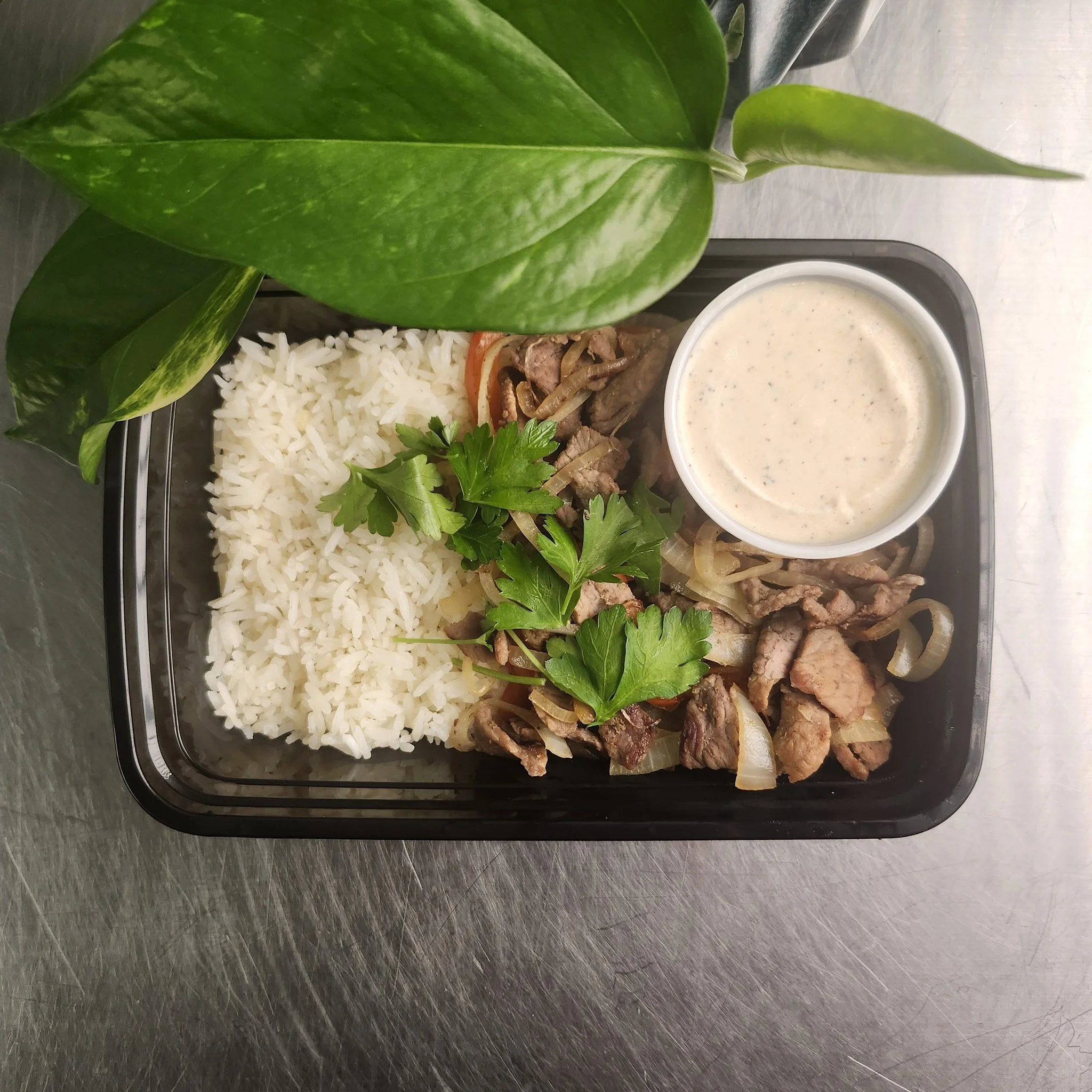 Philly Cheese Sauce, Beef, Onion, Bell Pepper, & Rice